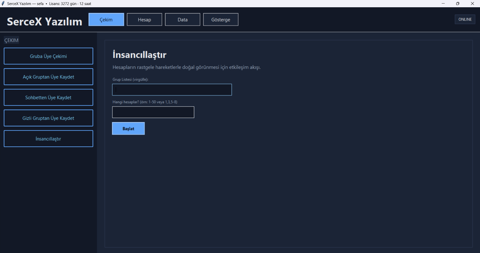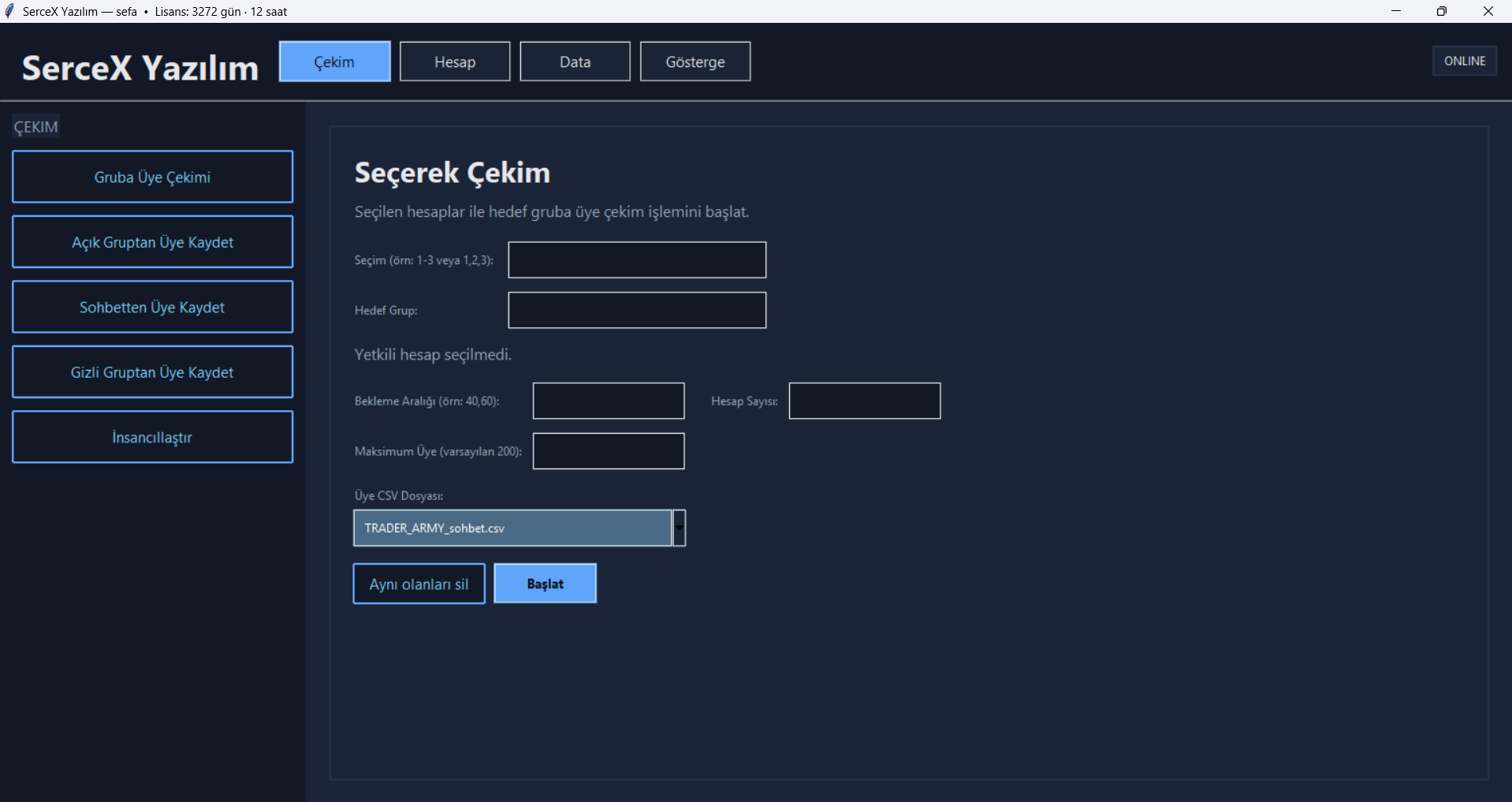 CSV üzerindentoplu mesaj gönderme Hesap aralığı, bekleme süresi, mesaj kontrolü Toplu profil işlemleri: ad – soyad – kullanıcı adı – profil fotoğrafı güncelleme